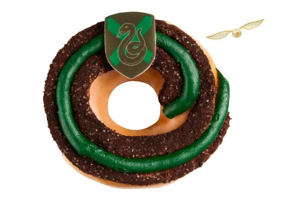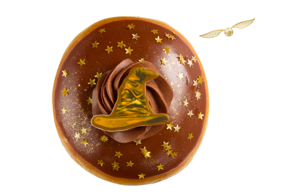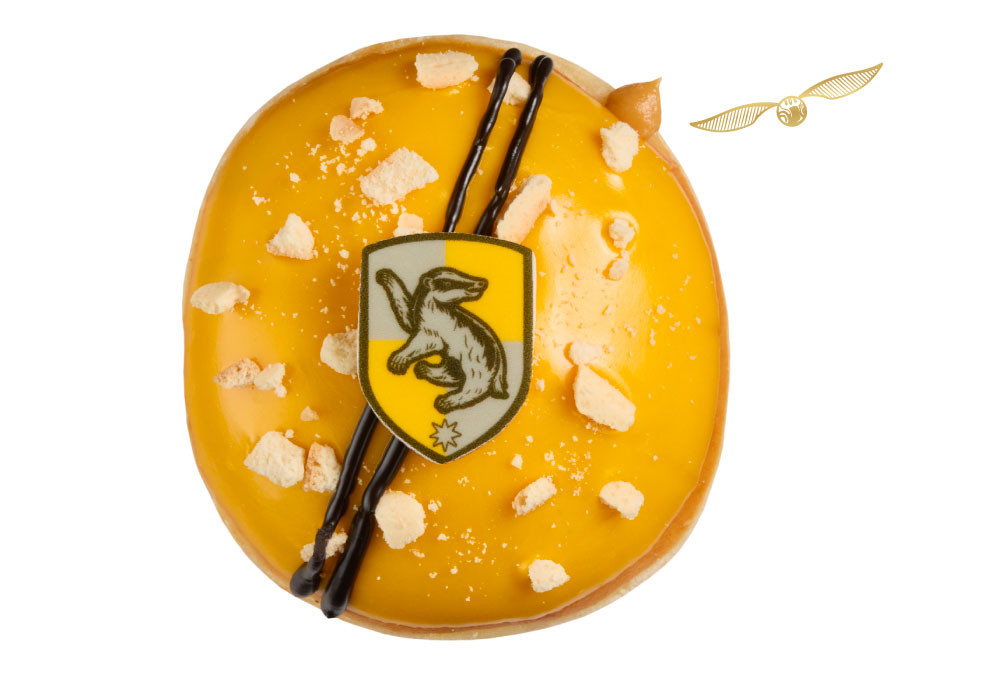 Shell rellena con Krema de butter toffee, bañada en icing amarillo y decorada con galleta y líneas de chocolate más el escudo de Hufflepuff®.