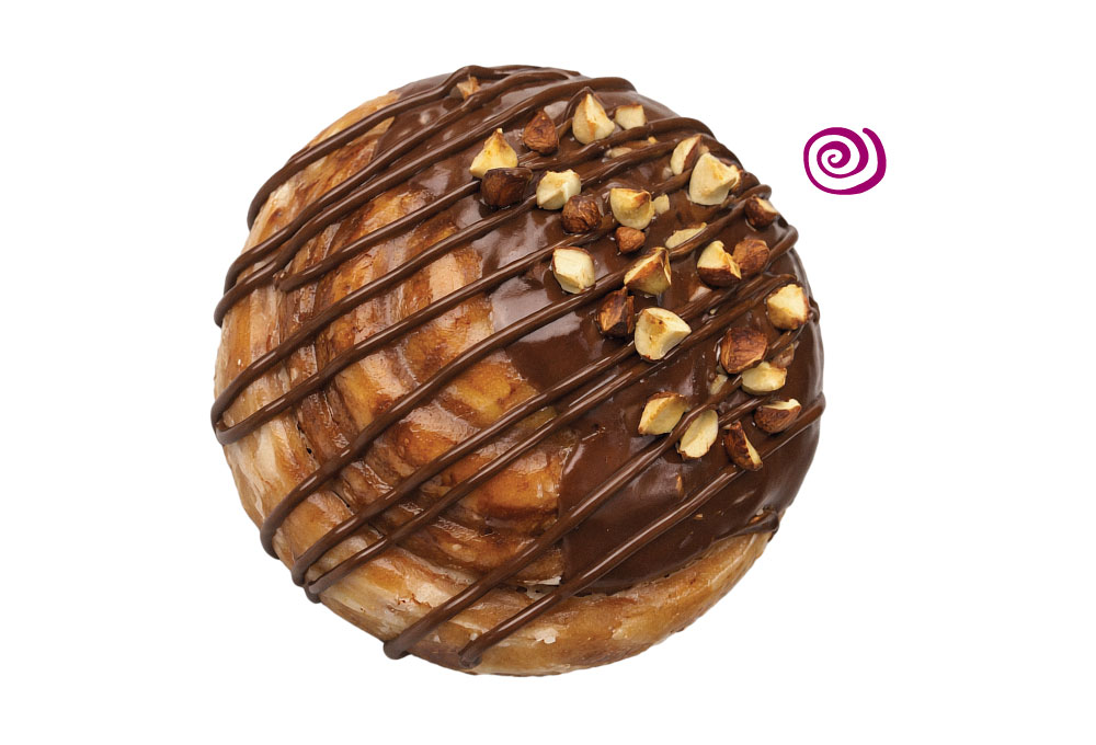 Rollo de canela con cobertura de crema de avellanas, trozos de avellanas y líneas de crema de avellanas