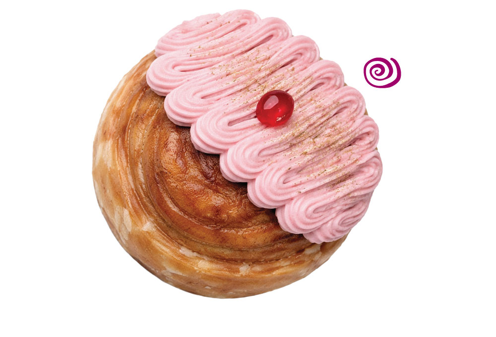 Rollo de canela con cobertura crema de frambuesa, decorado con un punto de jalea de frambuesa y oro comestible.